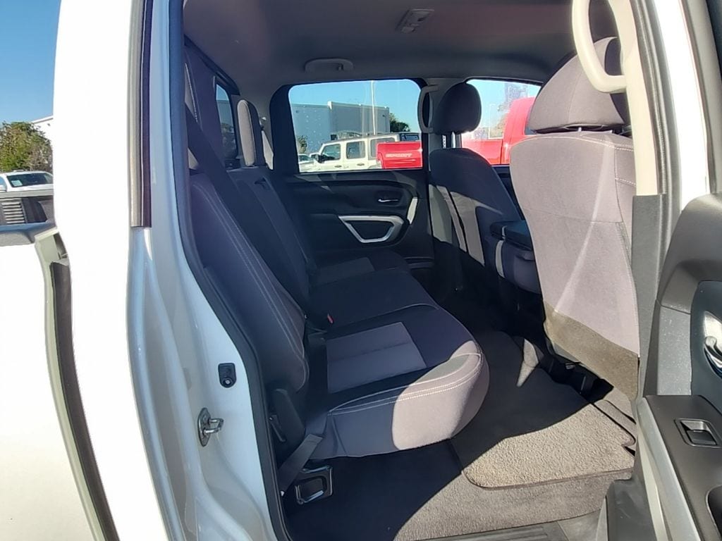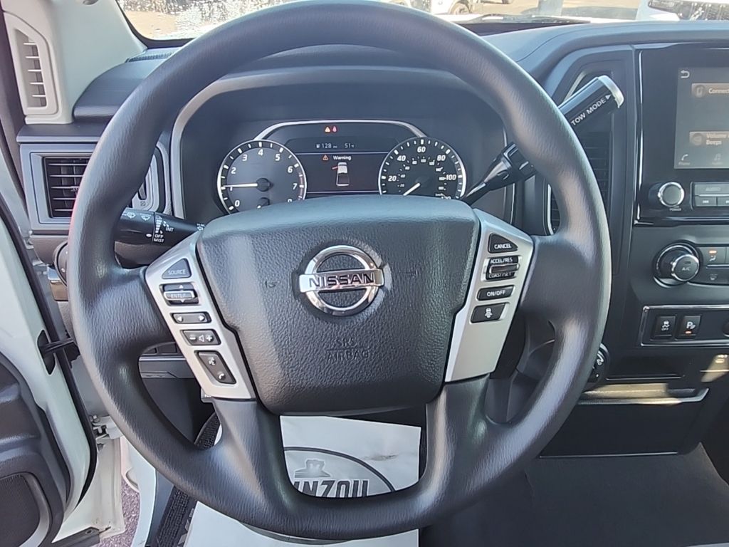 Glacier White 2022 Nissan Titan SV 4WD 9-Speed Automatic 5.6L V8 DOHC 32V 400hp 4WD, 3.69 Axle Ratio, 4-Wheel Disc Brakes, 6 Speakers, ABS brakes, Air Conditioning, Alloy wheels, AM/FM radio: SiriusXM, Auto High-beam Headlights, Blind Spot Warning, Brake assist, Bumpers: chrome, Carpet Floor Mats, Cloth Seat Trim, Driver door bin, Dual front impact airbags, Dual front side impact airbags, Electronic Stability Control, Front anti-roll bar, Front Center Armrest w/Storage, Front reading lights, Front Split Bench Seat (40/20/40), Front wheel independent suspension, Fully automatic headlights, Heated door mirrors, Illuminated entry, Knee airbag, Low tire pressure warning, NissanConnect featuring Apple CarPlay and Android Auto, Occupant sensing airbag, Outside temperature display, Overhead airbag, Panic alarm, Passenger door bin, Passenger vanity mirror, Power door mirrors, Power steering, Power windows, Radio data system, Radio: NissanConnect AM/FM, Radio: NissanConnect w/Navigation, Rear anti-roll bar, Rear Parking Sensors, Rear seat center armrest, Rear step bumper, Rear window defroster, Remote keyless entry, Security system, Speed control, Speed-sensing steering, Speed-Sensitive Wipers, Split folding rear seat, Steering wheel mounted audio controls, Tachometer, Telescoping steering wheel, Tilt steering wheel, Traction control, Trip computer, Variably intermittent wipers, Voltmeter, Wheels: 18" x 8" Silver Painted Alloy.